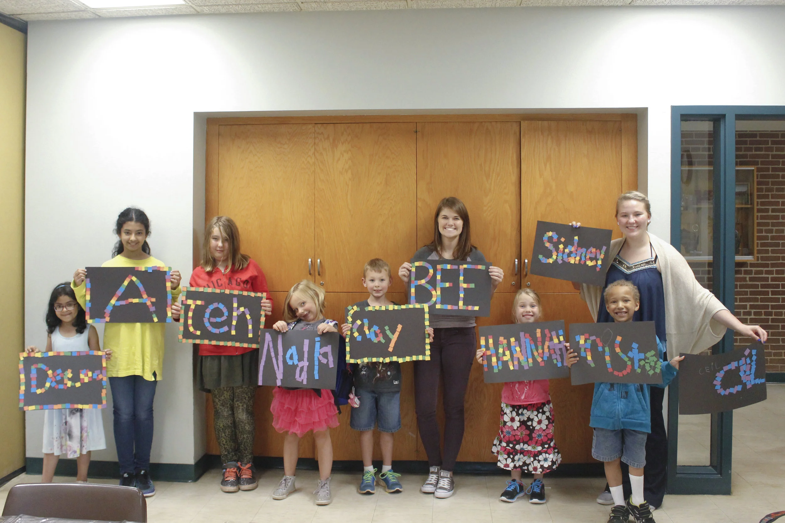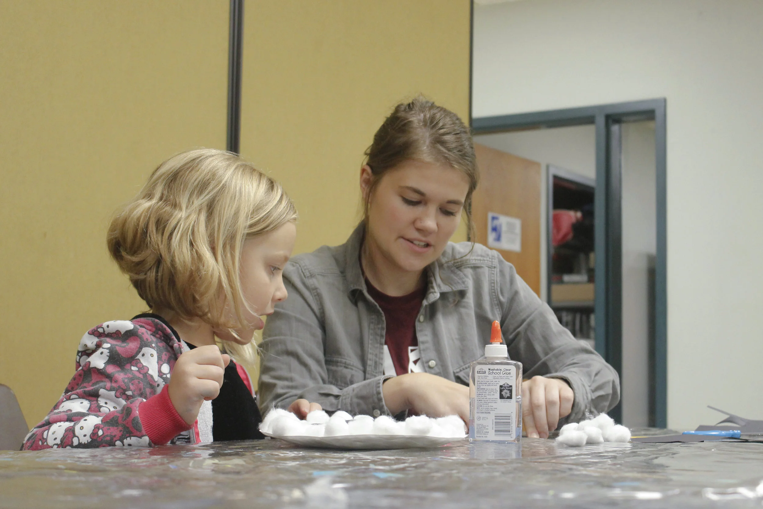 UW-Stout interns Brittney Hanson and Sidney Dombrowski with students from their Jump Start “Arts and Crafts” class.