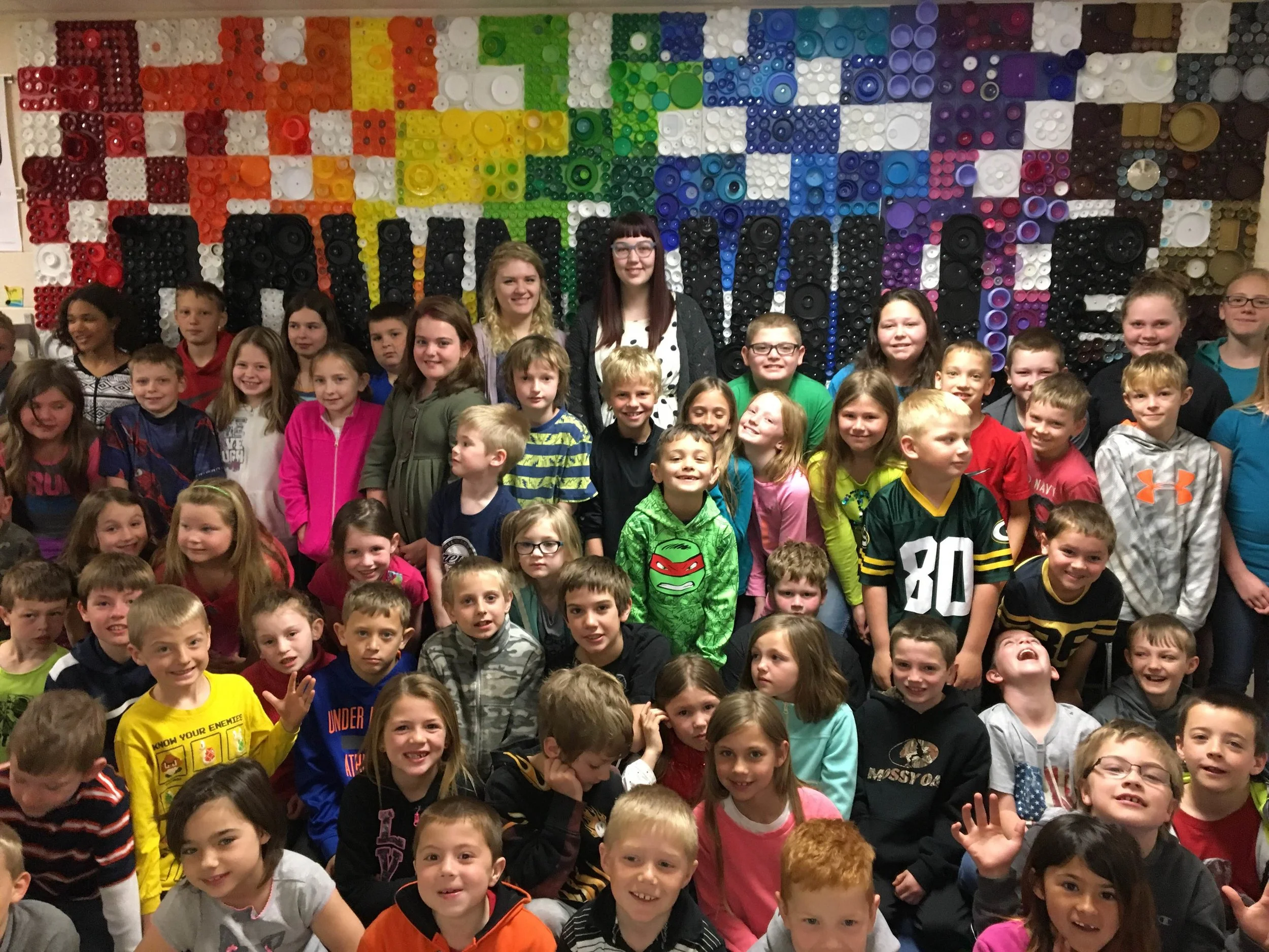 A visit to Downsville Elementary School highlighted the large-scale mural created last spring by PAINT interns from UW-Stout’s Art Education program, Grace Rogers and Abby Henderson. Rogers and Henderson met with the AIM team and spoke about their teaching experiences with the students at Downsville Elementary to create an upcycled mural made of thousands of bottle caps.