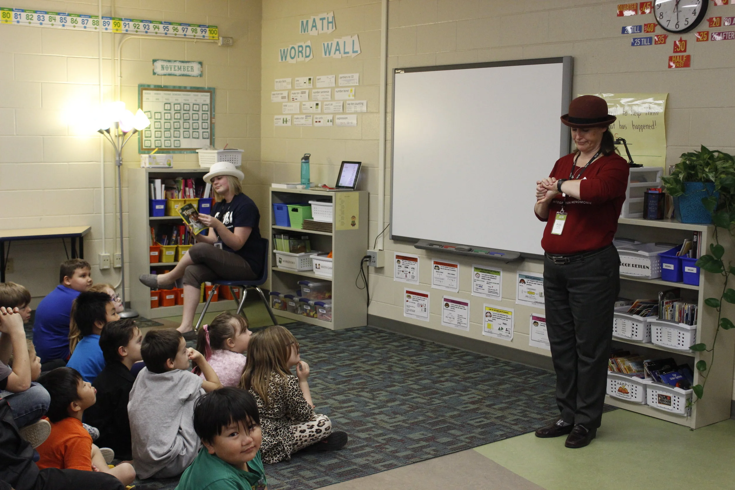 The day began at UW-Stout, observing AIM’s CITA Coordinator and Teaching Artist Kris Winter in professor Sapna Thapa's Early Childhood Education class for Expressive Curriculum. Encouraging the future teachers to find their storytelling voices, Winter demonstrated how to transform oneself into characters through the use of simple props. Winter inspired the university pre-service teachers to use storytelling to connect with all kinds of subject area learning as a means of achieving a deeper level of understanding in children.