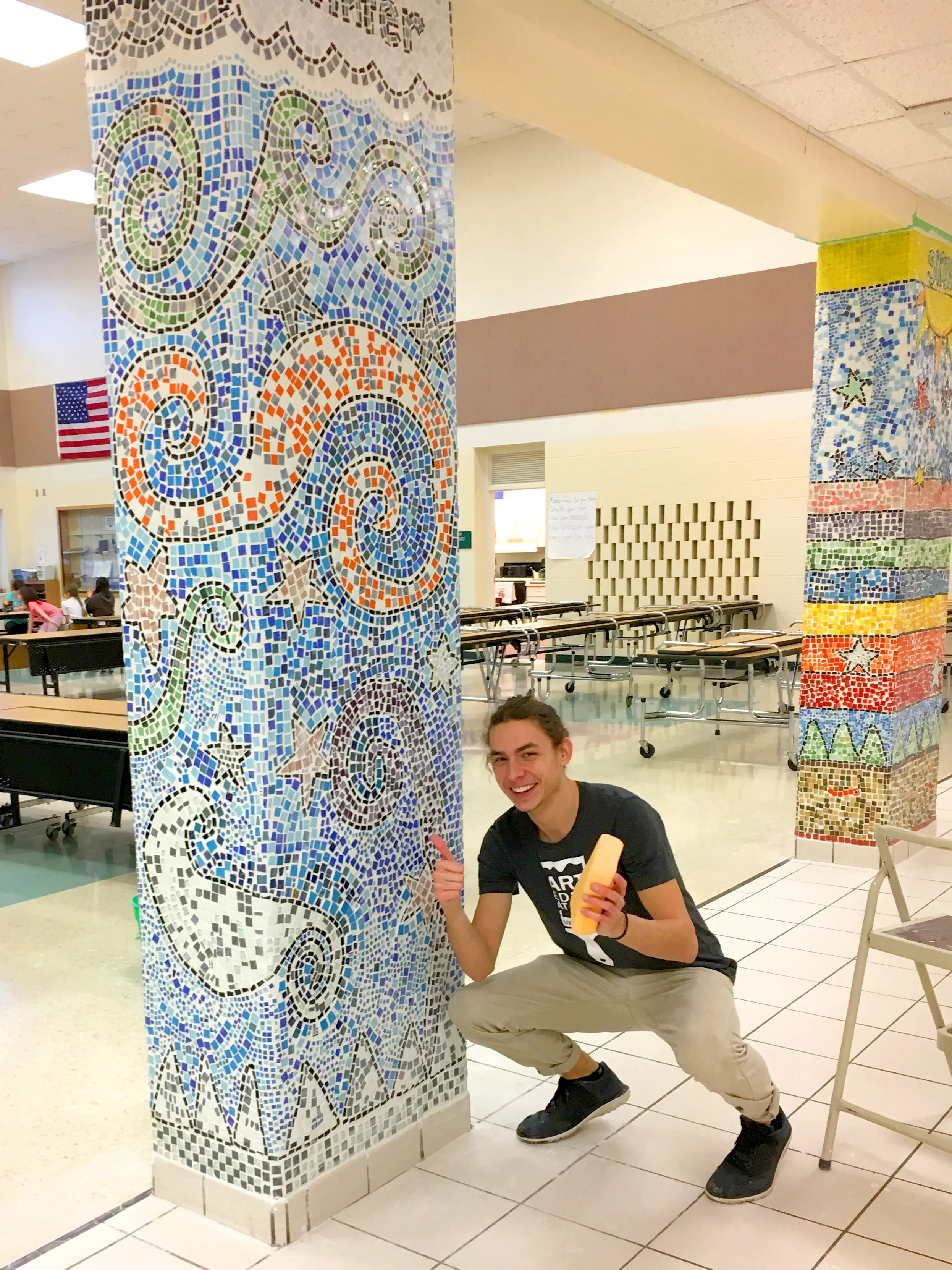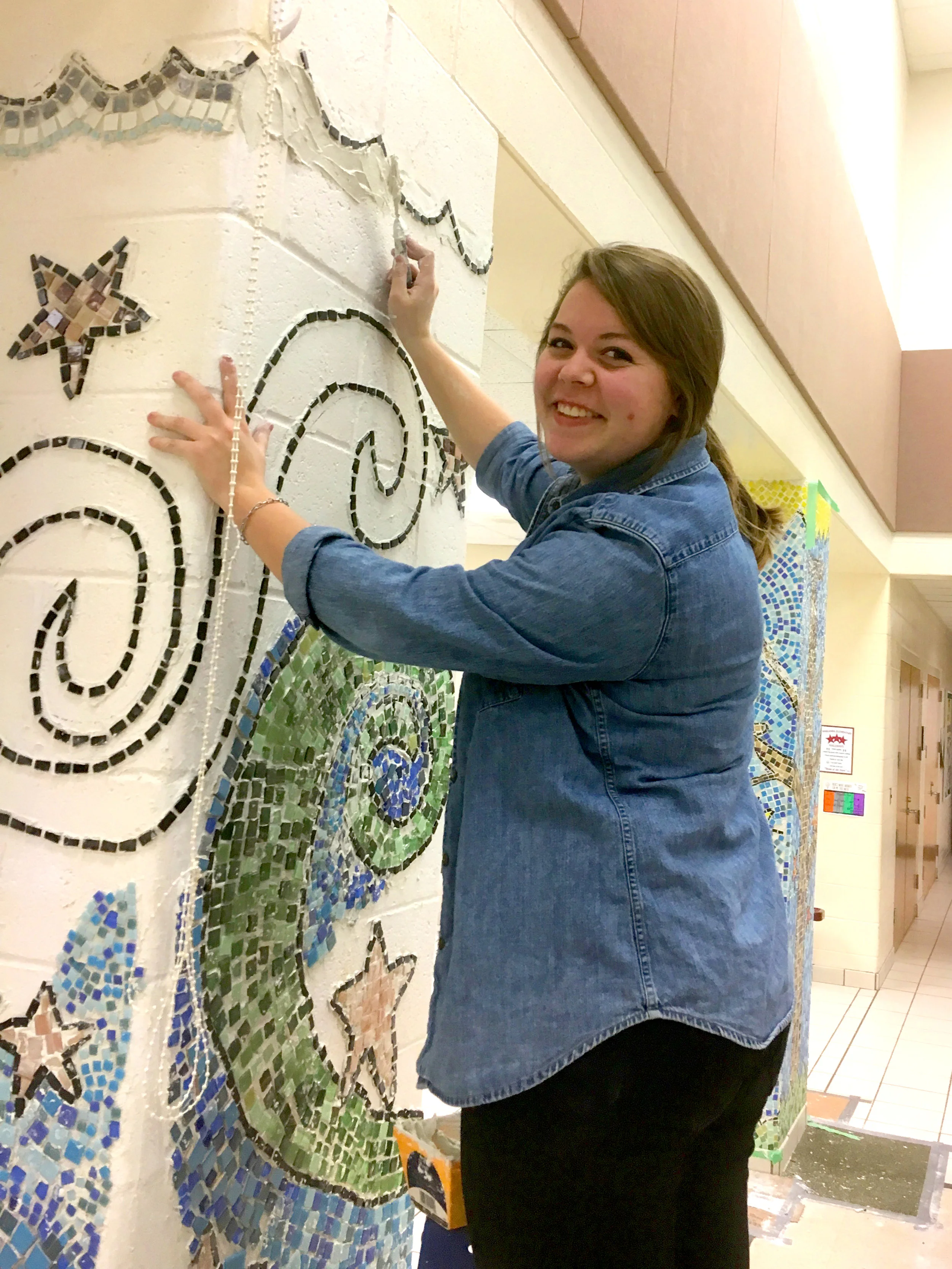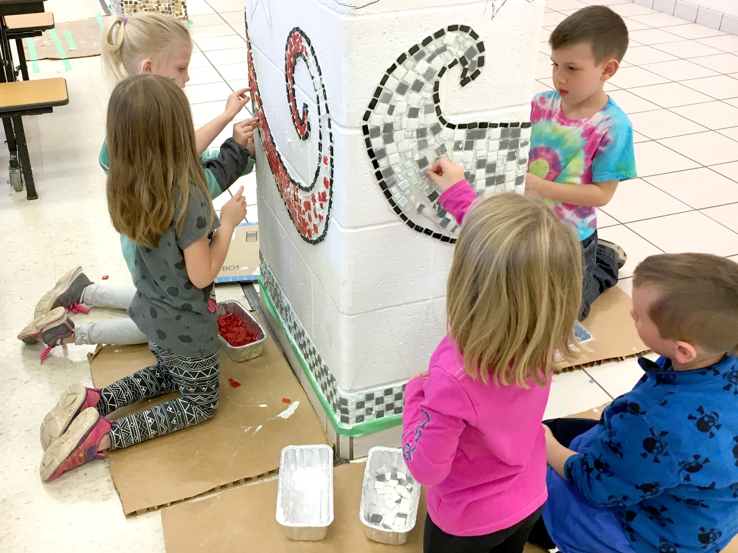 The last stop of the day was Wakanda Elementary School to see UW-Stout Art Education interns Marko Pechnik and Olivia Revolinski teaching students and teachers how to make a mosaic mural in their school. Pechnik and Revolinski spoke about their experiences in the creative making and teaching process; and they described the impact of the PAINT internships on their teaching development and confidence. Revolinski stated, “I love being able to provide opportunities for these students to experiment and make projects that stretch their creative minds; to create relationships with the youth of Menomonie who could possibly be my students in my student teaching in a couple years; and to learn how I can make myself a better educator.”